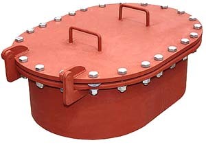 Корпус люка состоит из обечайки с приваренным к ней фланцем. К фланцу корпуса болтами и гайками через прокладку, обеспечивающую герметичность соединения, крепится крышка. На крышке имеются ручки для транспортировки люка в собранном состоянии или для её открывания.